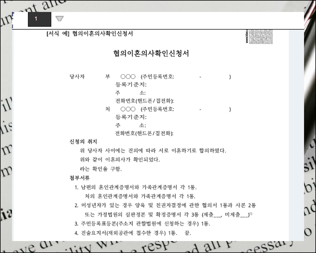 가장 많이 이용이 되는 이혼서류 양식을 무료 다운받아 살펴보니 신청서 작성이 정말 간단해요. 각 항목의 빈 공간을 차례로 기입하기만 하면 되거든요. 문서 안에는 함께 제출해야 할 필수 첨부 자료 목록도 명확하게 적혀 있습니다.