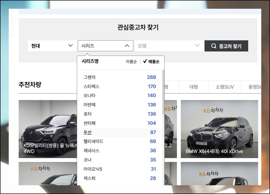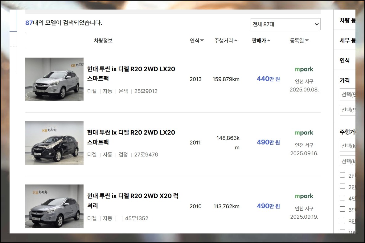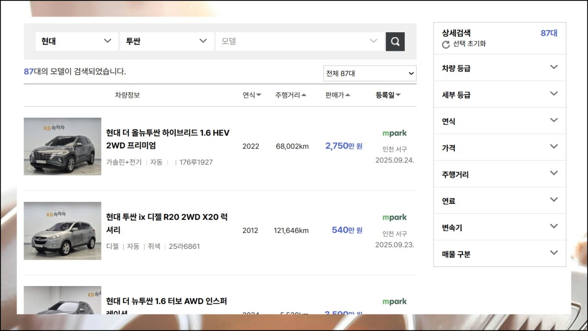 중고 차량 시세 확인할 때 제가 자주 이용하는 곳이 다나와 자동차 사이트예요. 투산이 인기 모델이다 보니 매물도 상당히 많이 올라와 있어서 선택의 폭이 넓습니다.
