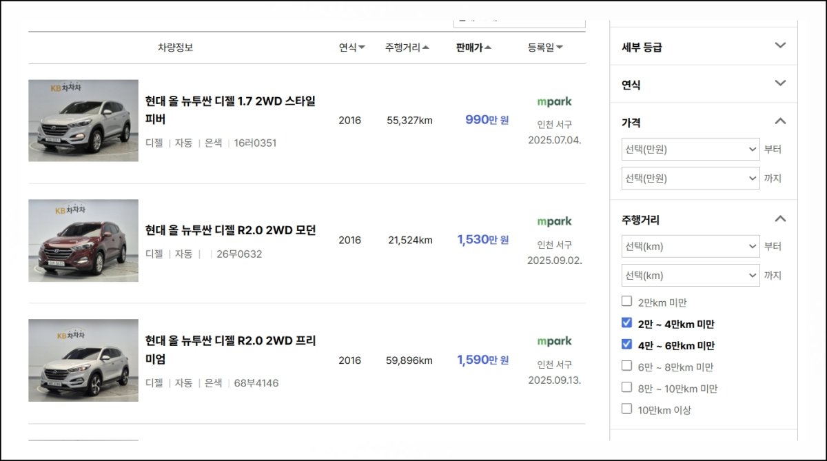 목록 오른쪽에 다양한 필터 조건이 있어요. 차량 등급부터 세부 등급, 연식, 가격, 주행거리까지 원하는 조건을 지정할 수 있습니다. 저는 주행거리를 2만에서 6만KM 사이로 설정해봤는데요.