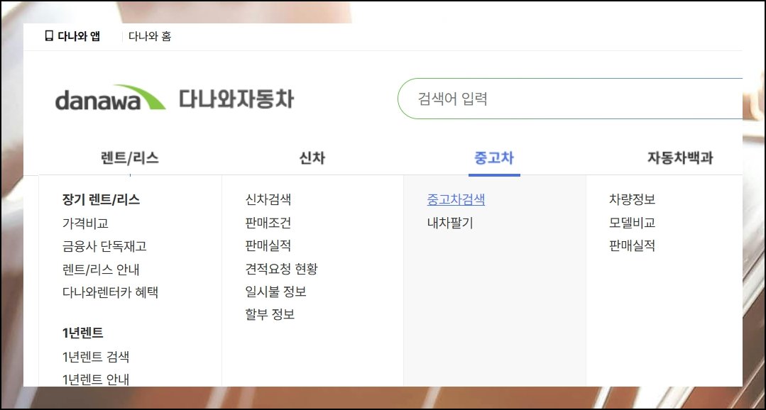다나와 자동차 홈페이지에 들어가신 후 메뉴에서 중고차 검색 버튼을 눌러주세요. 이 사이트의 장점은 중고 차량 정보뿐만 아니라 신차 데이터나 렌트, 리스 정보까지 한 번에 볼 수 있다는 점이에요.