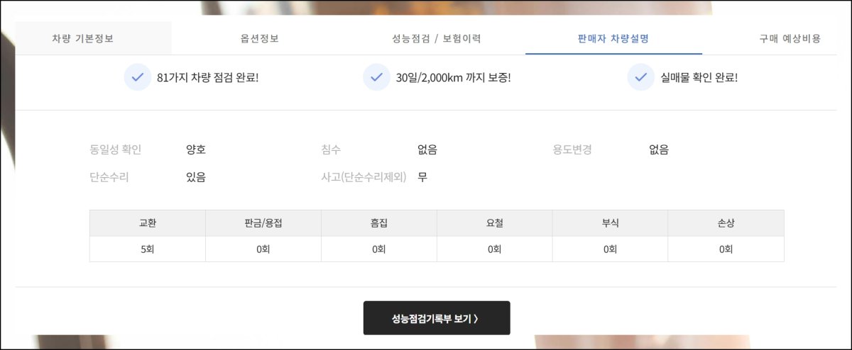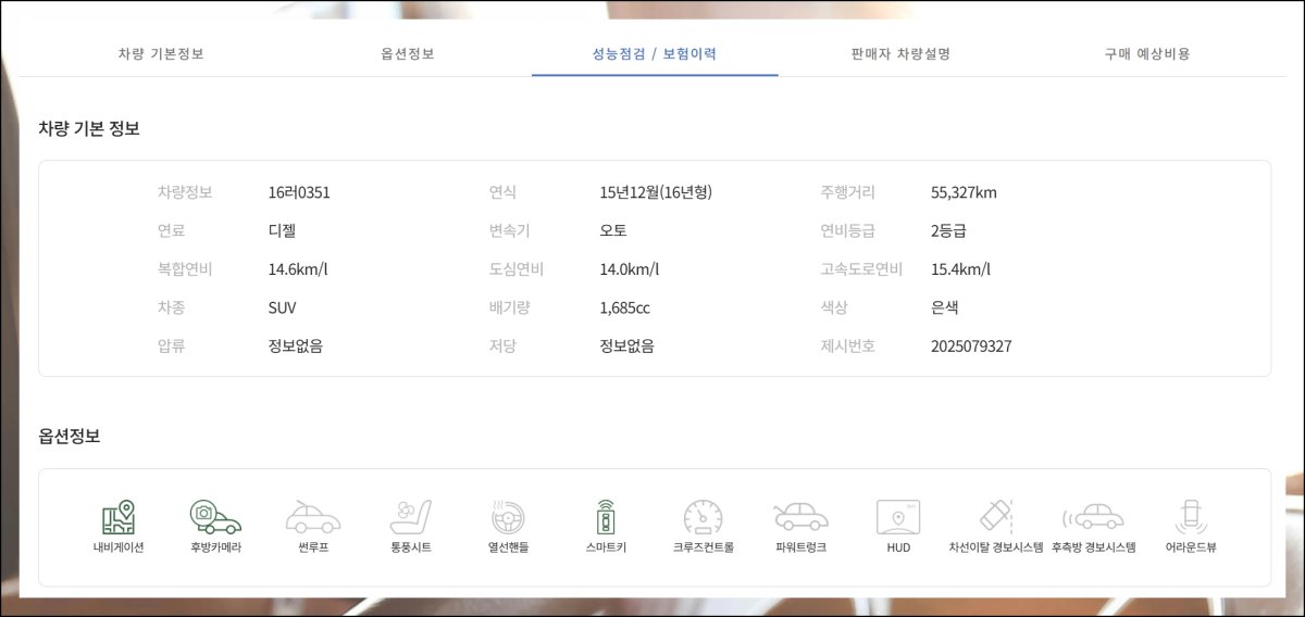 사진 외에도 차량에 대한 방대한 정보를 확인할 수 있어요. 자동차 구매할 때는 옵션 사항과 성능 점검 부분을 특히 꼼꼼히 보는 게 좋아요.