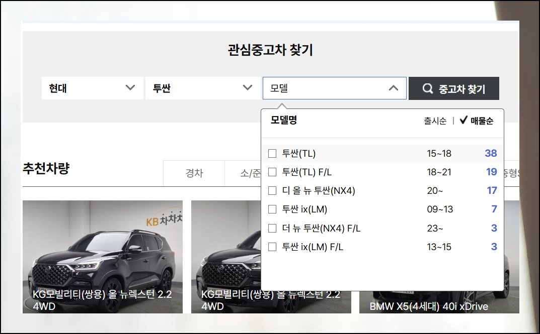 투산에 대한 전체 모델 검색 결과가 목록 형태로 나타나니다. 기본 차량 정보가 표시되고, 사진을 눌러보면 더 자세한 내용을 볼 수 있어요. 연식이나 주행거리, 판매가 항목을 눌러보면 원하는 기준으로 매물들을 정렬할 수 있습니다.