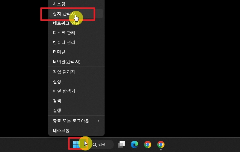 키보드 드라이버에 오류가 난 경우에는 한글은 물론이고, 전체적으로 키보드 자판이 안쳐져요. 이럴 때 대처 방법은 드라이버를 재설치하는 것이에요. 우선 기존에 잘못 설치되어 있거나 충돌이 난 키보드 드라이버를 삭제해야 하는데요. 윈도우 시작 버튼에 마우스 우클릭 후 [장치 관리자]를 선택하면 여러 장치에 관련된 드라이버 삭제를 진행할 수 있어요.