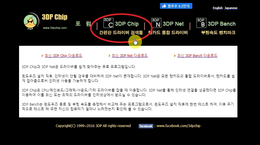 3dp chip 사이트에 접속했어요. 이곳에서는 메인보드, cpu, 그래픽카드, 랜카드, usb, 사운드카드 등 내 컴퓨터에 장착이 되어 있는 하드웨어에 알맞는 드라이버 프로그램을 손쉽게 찾을 수 있도록 도와주는 프로그램을 제공하고 있어요. 사용 방법은 엄청 간단한데요. 일단 메뉴에서 [간편한 드라이버 검색툴]을 선택하여 3dp chip 다운 및 설치를 진행해주세요.