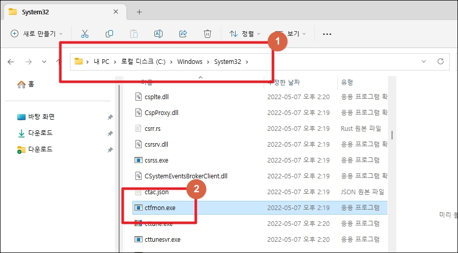 가끔 ctfmon.exe 실행 관련하여 충돌이 있을 때 한글 자판이 안쳐져요. 이럴 때에는 윈도우 폴더 안에 있는 system32 폴더를 열어보세요. 그럼 ctfmon.exe 파일을 찾을 수 있는데요. 해당 파일을 마우스로 더블 클릭하여 실행해 주면 돼요.