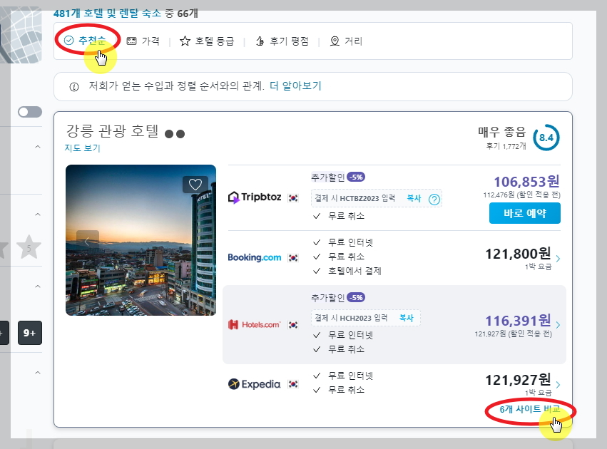 추가로 정렬 기능에서 "추천순" 설정을 하게 되면 특가 위주로 숙소 리스트를 받아볼 수 있습니다. 높은 순위를 차지한 강릉관광호텔을 예약할 수 있는 서비스가 6개가 된다고 하는데요. 화면에 있는 "6개 사이트 비교"를 클릭해 보세요. 그럼 해당 호텔에 대한 여러 사이트의 가격 순위를 확인할 수 있습니다.