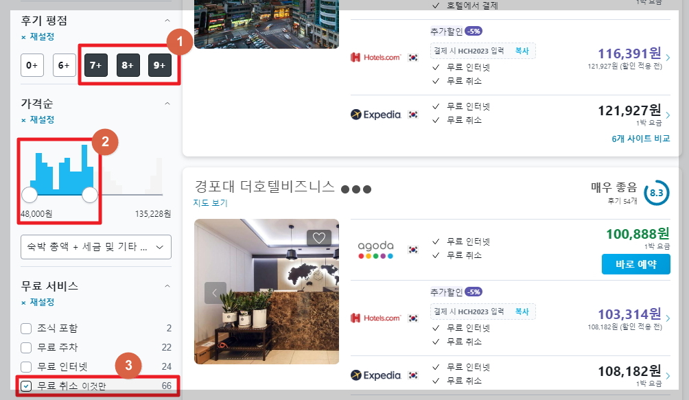 일단 검색 결과에서 필터를 꼭 사용하는 것이 좋습니다. 어느 정도 자신이 원하는 조건을 충족하는 호텔을 비교하거나 모든 서비스 가격을 비교하는 것이 효과적이기 때문인데요. 좌측에 있는 평점, 가격, 무료 서비스를 본인의 취향에 맞게 선택해 주세요.