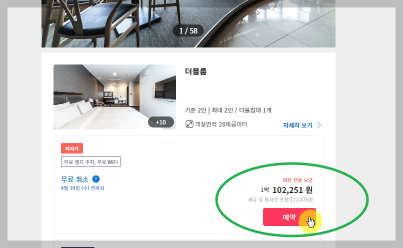 가격이나 선호하는 예약 사이트의 "상품 확인" 버튼을 눌러보세요. 그럼 해당 호텔에 대한 상세 페이지와 함께 예약을 바로 진행할 수 있도록 예약 버튼이 마련되어 있습니다. 해당 버튼을 누른 후 이용자 정보를 입력한 후 결제를 진행하면 예약 완료를 할 수 있어요.