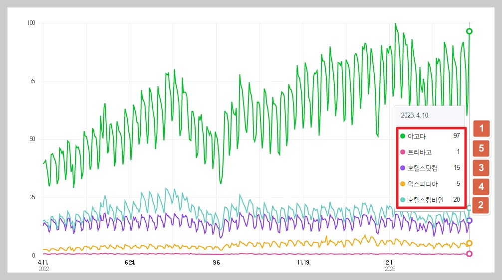 인터넷 상에서 검색하는 양을 가지고, 사람들이 많이 이용하는 호텔 가격 비교 및 예약 사이트에 대한 순위를 매겨 보았습니다. 1위는 아고다, 2위는 호텔스컴바인, 3위를 호텔스닷컴, 4위는 익스피디아, 5위는 트리바고가 나왔는데요. 이 밖에도 다양한 서비스가 많지만, 어느 정도 신뢰가 되는 순위 데이터라고 생각합니다.