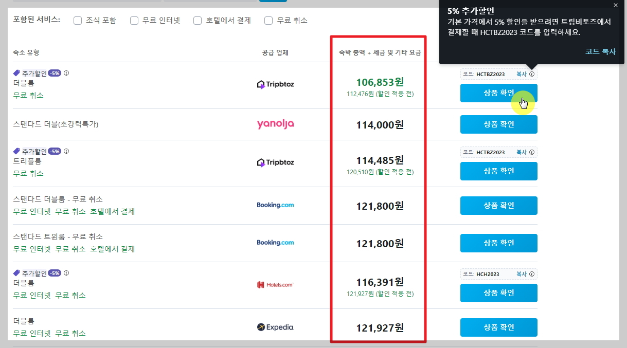 새롭게 열린 페이지에서 보면 가장 저렴한 금액부터 강릉관광호텔을 예약할 수 있는 서비스 업체 리스트가 나타나는데요. 최근에는 추가 할인 코드를 제공하는 곳도 많더군요. 똑똑하게 사이트 비교를 하면서 이러한 추가 할인까지 챙기면 더욱 만족도 높은 여행을 할 수 있을 거에요.