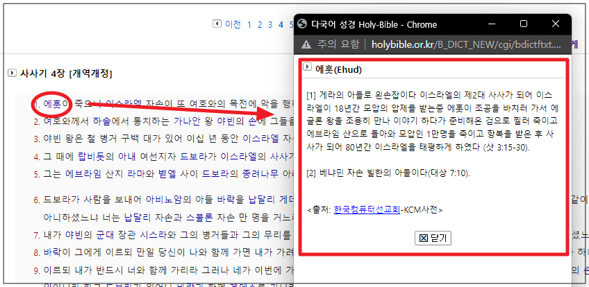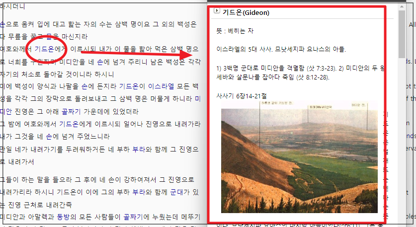 5. 성경을 읽다가 인물이나 어려운 단어가 나오는 경우가 자주 있는데요. 이런 경우에는 마우스로 클릭을 해 보세요. 그럼 새창이 열리면서 기독교 관련 사전이 나타납니다. 정말 유용한 기능인데요. 파란색으로 된 단어만 클릭 할 수 있으니 이 점을 유의해 주세요.
