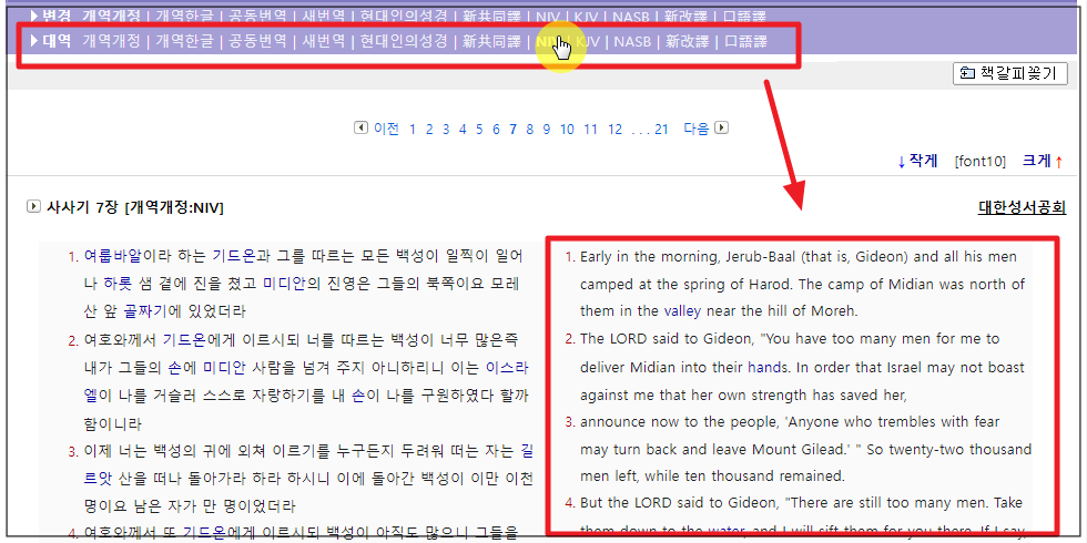 6. 여기서 성경을 읽을 때 또 한 가지 장점이 있습니다. 바로 외국어로 된 성경과 함께 읽을 수 있다는 것인데요. 화면 상단에 보면 외국어 버전의 성경을 선택할 수 있습니다. 이를 선택하면 좌측에는 한글로 된 문장이 나오고, 우측에는 외국어로 된 문장이 나타납니다. 영문으로 읽고 싶은데 해석하기 어려워서 포기했던 분들은 이 기능을 꼭 활용해보시길 바랍니다.