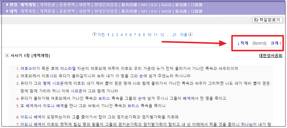 4. 저는 구약의 사사기 1장 선택했습니다. 온라인 상에서 나타나는 텍스트의 경우에는 크기를 조절할 수 있습니다. 화면에서 우측 상단에 있는 작게 또는 크게 버튼을 눌러 보세요. 글자가 너무 작다고 생각되는 분들은이 기능을 사용하시면 됩니다.