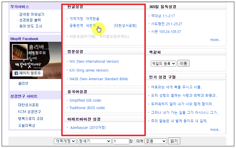 2. 사이트에 접속하면 메인화면에 여러가지 성경 종류가 나타나는데요. 보시는 바와 같이 영어, 중국어, 아르젠바이잔 버전으로 된 것도 읽을 수 있습니다.