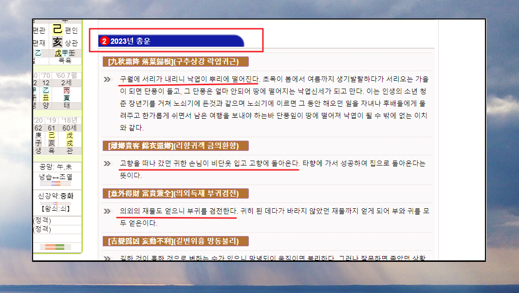 이렇게 2023년 총운과 월별세운을 보면 토정비결은 다 본거나 다름 없는데요. 여기에 더하여 좀 더 많은 운세풀이를 보고 싶다면 당사주를 추천 드리고 싶습니다. 이것도 무료로 이용이 가능한데요. 꽤 많은 운에 대해 알아볼 수 있습니다.