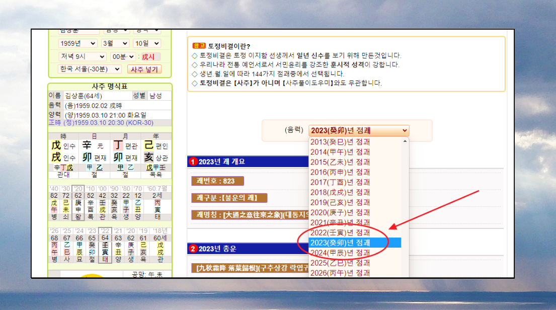 제가 주로 이용하는 운세 사이트의 경우에는 2023년을 포함하여 앞으로 몇 년간의 토정비결 점괘를 볼 수 있도록 되어 있습니다. 그만큼 역술 분야에 있어서 자신감을 보이는 곳인데요. 직접 이용해 보면 아시겠지만, 다른 역술 사이트와 수준이 다릅니다. 일단 토정비결은 우리나라 전통 예언서인데요. 잘 맞아서 현대까지 내려온 것이랍니다.