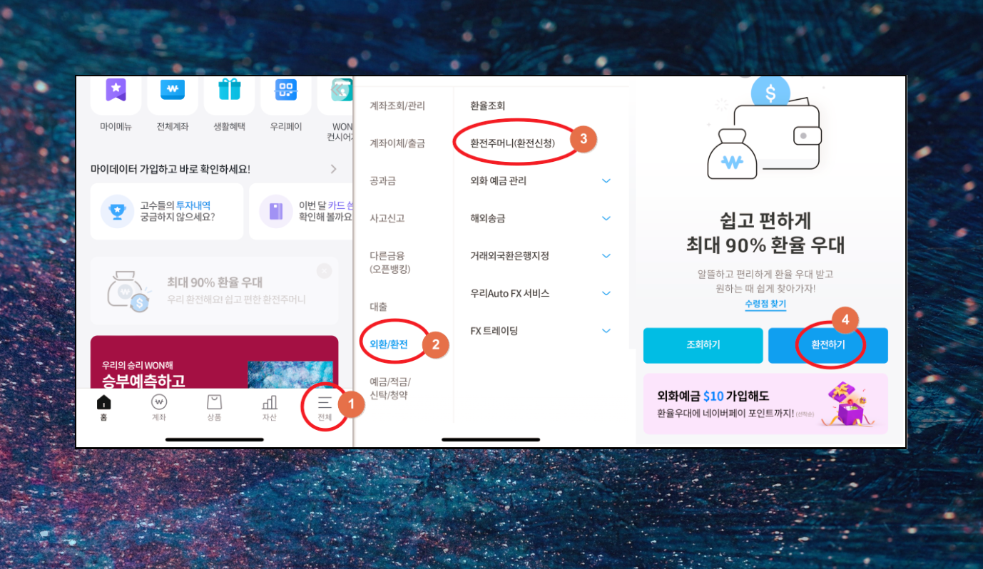 우리 WON 뱅킹 앱을 실행했습니다. 첫 화면에서 우측 하단에 있는 [전체] 버튼을 클릭해 주세요. 그럼 여러 가지 메뉴가 나타나는데요. 여기에서 [외화 / 환전]을 선택합니다. 그럼 환율 조회, 외화 예금 관리, 해외 송금 등 여러 가지 메뉴가 나타나는데요. 여기에서 [환전 주머니] 메뉴를 선택합니다. 새롭게 열린 화면을 보면 최대 90% 환율 우대를 받아 싸게 진행할 수 있다고 명확하게 나와 있는데요. 그럼 [환전하기] 버튼을 눌러 진행하는 방법을 따라해 보세요.