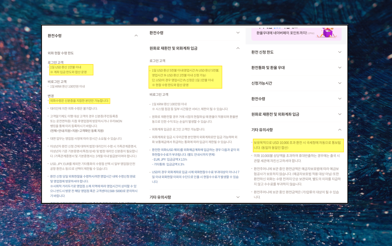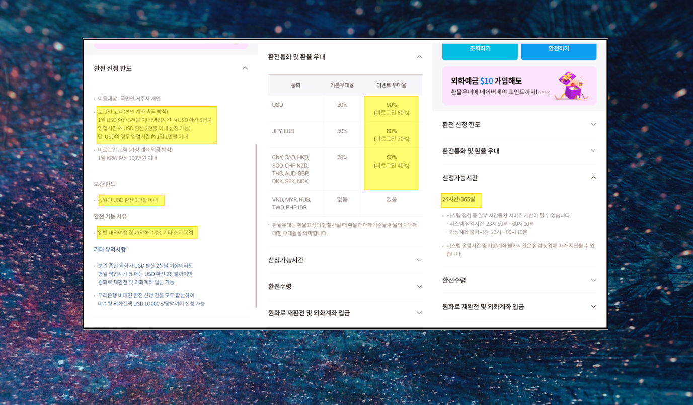 여기까지 진행했으면 달러를 제대로 구매할 수 있었을 겁니다. 그럼 추가로 주요하다고 판단되는 안내 사항을 몇 가지 언급해 보겠습니다. 일단 해당 앱을 사용할 때 로그인 고객의 경우에는 1일 USD 환산 5천불 또는 1만불 이내까지 신청이 가능합니다. 보관도 1만불 할 수 있죠. 환전 신청을 할 수 있는 시간은 365일 24시간 모두 가능한데요. 시스템을 점검하거나 가상계좌 불가한 시간에는 일시적으로 신청이 불가합니다.