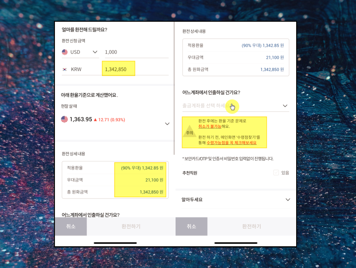 우리가 입력한 달러 금액에 대하여 얼마의 원화가 필요한지 자동으로 계산이 되는데요. 이에 따라 적용 환율, 우대 금액도 함께 확인이 가능합니다. 확인 후에 인출할 계좌를 선택해야 하는데요. 참고로 주의해야 할 부분이 있습니다.