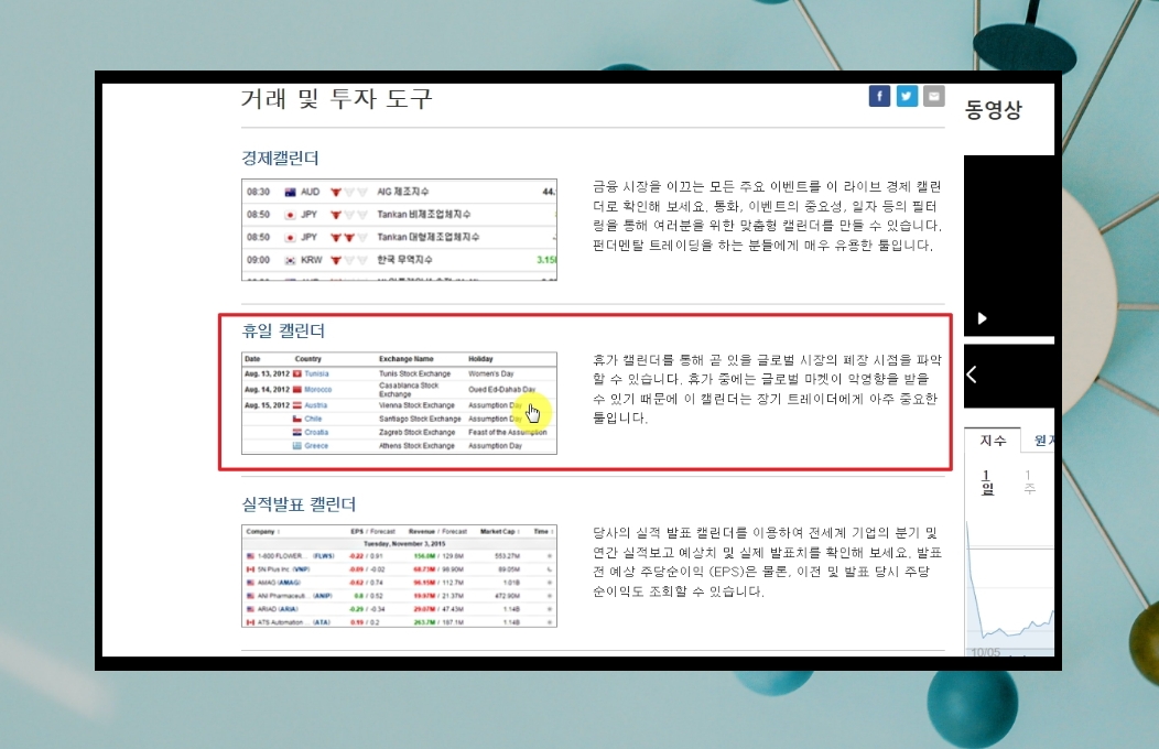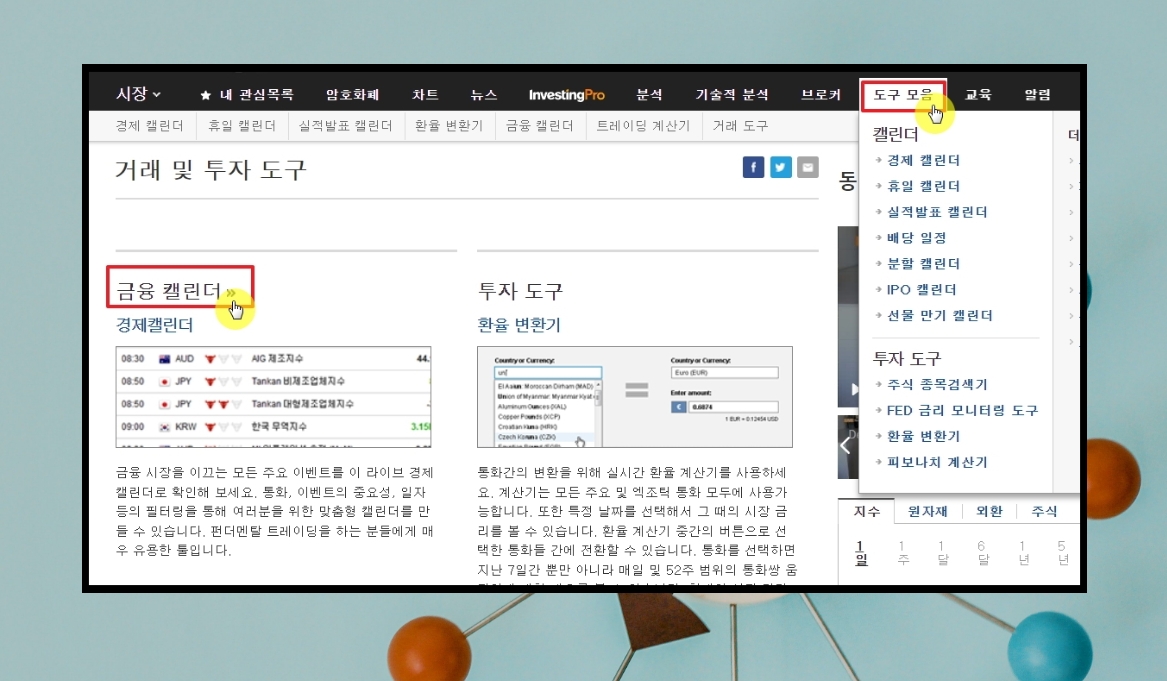 4. 인베스팅 홈페이지에 접속했습니다. 메뉴에서 [도구 모음]을 선택해 봅니다. 그럼 [거래 및 투자 도구] 페이지가 열립니다. 여기에서 [금융 캘린더]를 선택하면 미국증시 개장시간 한국시간 기준값과 함께 휴장일 여부를 알 수 있는 서비스가 나타납니다.