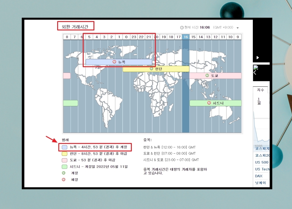 6. 이번에는 미국증시의 외환 거래시각을 살펴보겠습니다. 주식 거래를 하는기간보다 범위가 넓다는 것을 알 수 있습니다. 범례를 보면 현재 한국을 기준으로 얼마 뒤에 장이 열리는지 알 수 있습니다. 매매를 준비할 때 이를 참고하면 됩니다.
