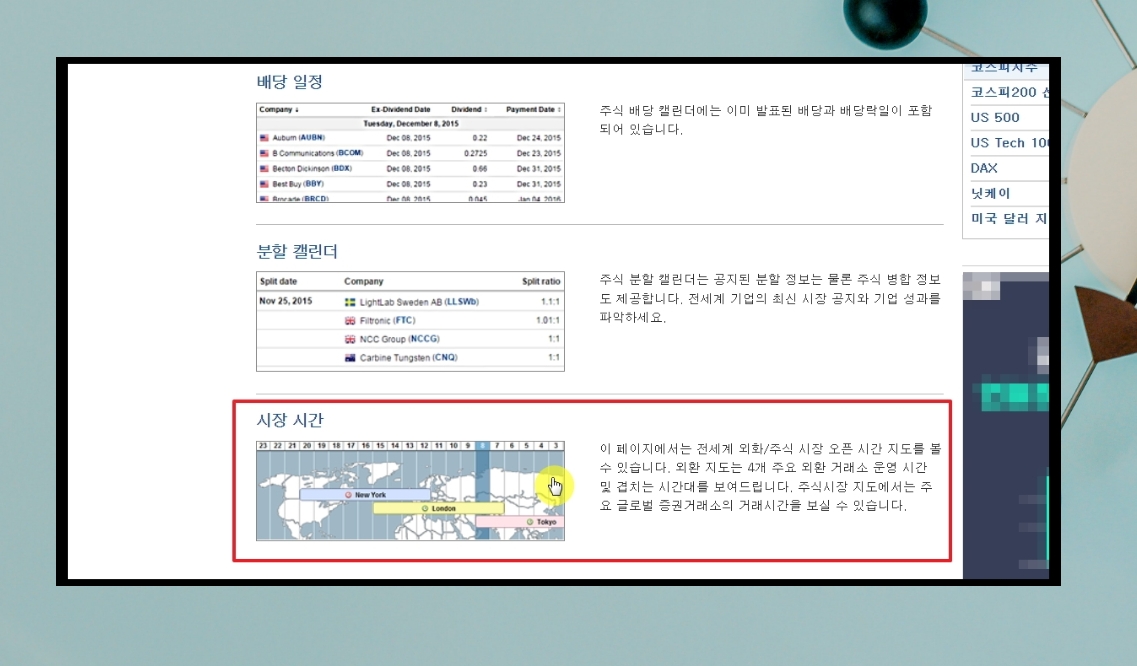 3. 앞서 보여드린 세계 증시 개장시간 차트를 이용하면 썸머타임이 적용되었는지 쉽게 파악할 수 있습니다. 해당 서비스는 인베스팅 사이트를 통해 무료로 사용이 가능합니다. 휴장일 정보와 함께 어떻게 이용하는지 알려드리겠습니다.