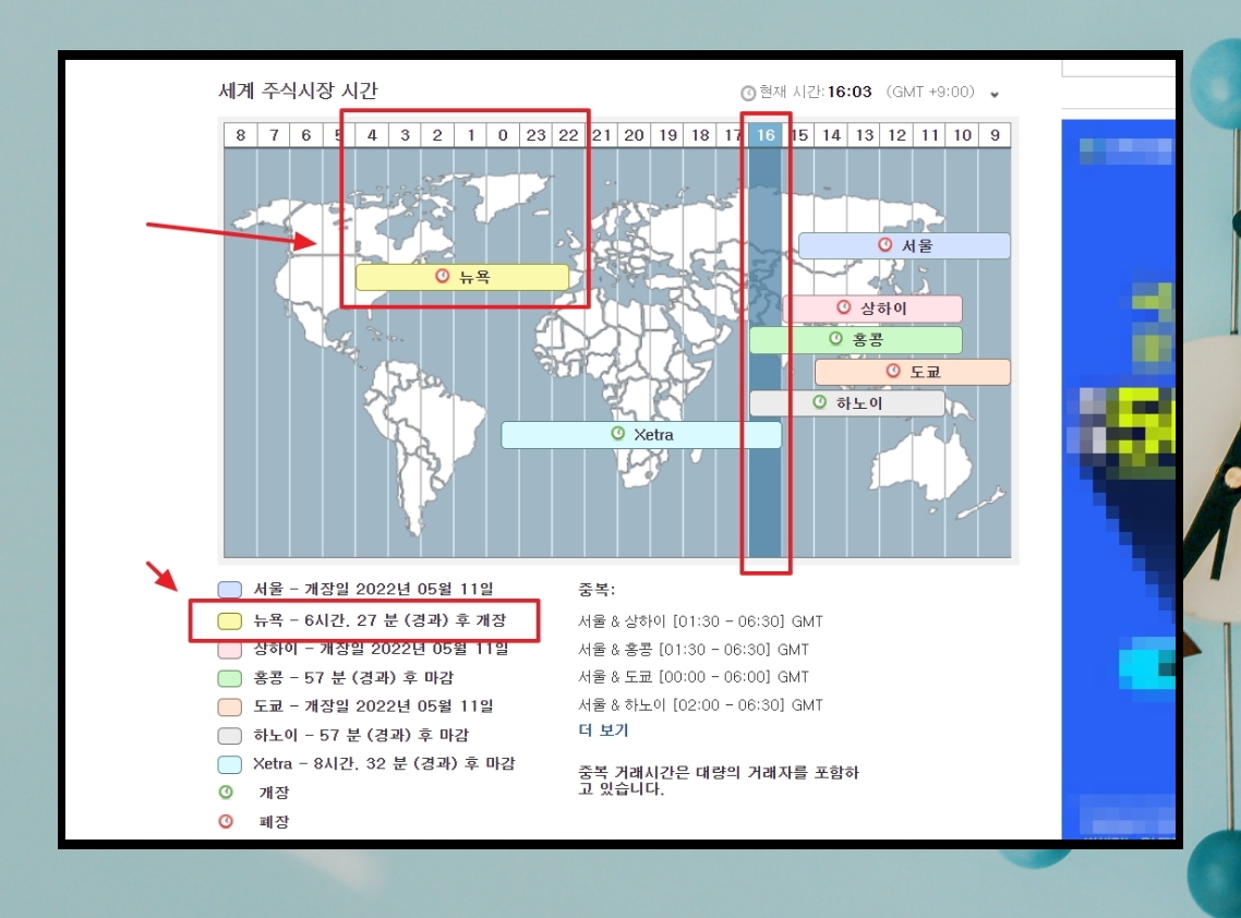 1. 제가 여러 나라 주식시장에 대한 정보를 알아보고 싶을 때 이용하는 서비스는 다음과 같이 생겼습니다. 현재 한국의 시각은 16시를 가리키고 있죠. 시간이 흐를수록 해당 표시가 움직입니다. 그리고 표시가 뉴욕 거래소에 도달하면 미국증시가 열려있음을 의미합니다. 그림 차트에서 보면 미국증시 개장시간은 한국을 기준으로 22시 30분이죠. 폐장은 오전 5시에 된다고 표시되어 있습니다.