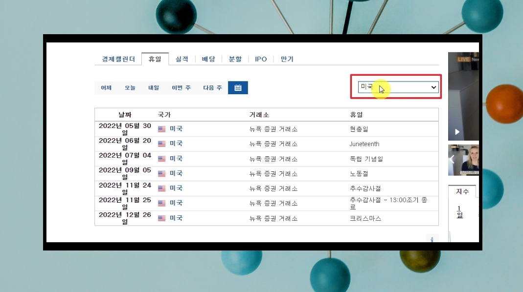 8. 휴일 캘린더 페이지가 열렸습니다. 우측 상단에 있는 셀렉트 박스에서 나라 이름을 "미국"으로 변경합니다. 그럼 미국증시가 열리지 않는 휴장일을 확인할 수 있습니다. 기간 설정이 가능하기 때문에 언제 휴장일이 있는지 알아볼 수 있습니다.
