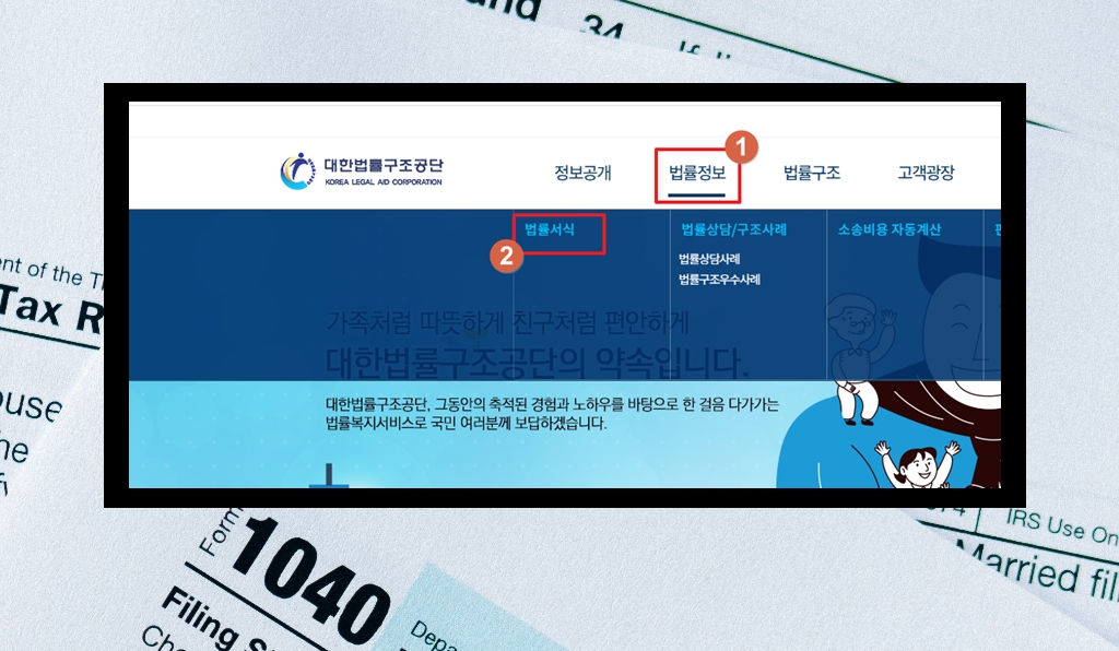 3. 대한법률구조공단 홈페이지에 접속했어요. 법원 이혼서류를 다운 받으려면 메뉴에 있는 "법률정보"를 클릭해 주세요. 그럼 하위 메뉴로 법률상담, 구조사례, 소송비용 자동계산 등이 나타나는데요. 여기서 가장 첫 번째에 있는 "법률서식"을 클릭해 주세요.