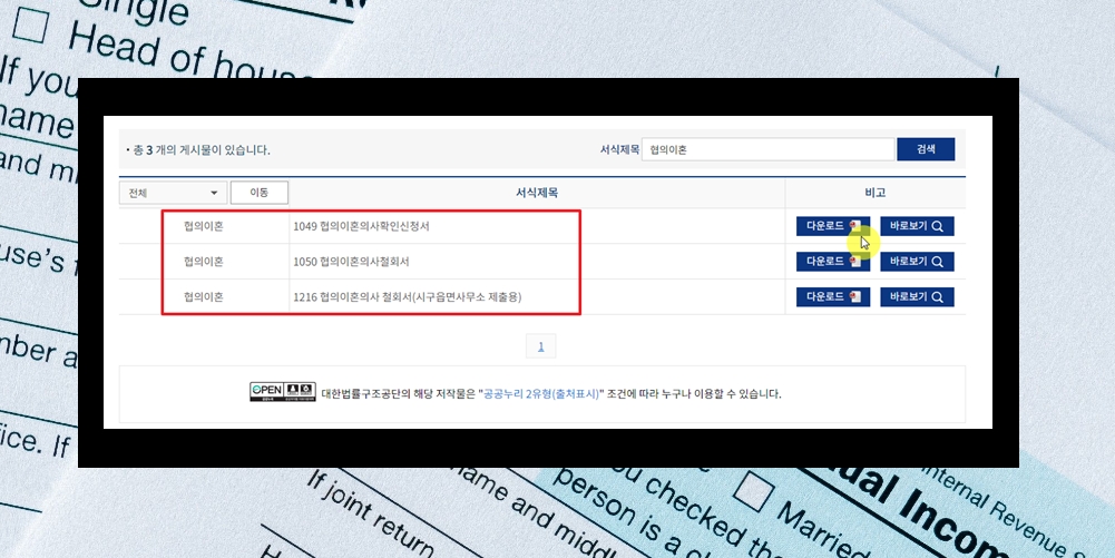 6. 해당 사이트에서 제공하는 양식은 수십 가지가 되는데요. 그 중에서 협의이혼에 관련된 것은 3개가 있네요. 법원에 제출할 수 있는 신청서와 철회서 그리고 읍면사무소 제출용 철회서 이렇게 3가지인데요. 아래아 한글 문서로 다운로드 받을 수 있도록 되어 있어요. 해당 양식을 다운 받기 이전에 어떤 내용이 있는지 확인하고 싶으면 "바로보기" 버튼을 클릭하면 돼요.