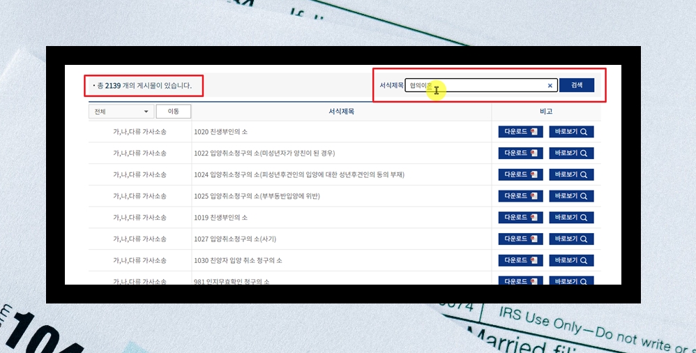 5. 이곳에서 제공하는 서식의 총 갯수는 2139개에요. 간단하게 서식 제목으로 "협의이혼"을 입력한 후 검색 버튼을 클릭해 보세요. 그럼 우리가 찾는 서식 리스트가 나타날 거에요.
