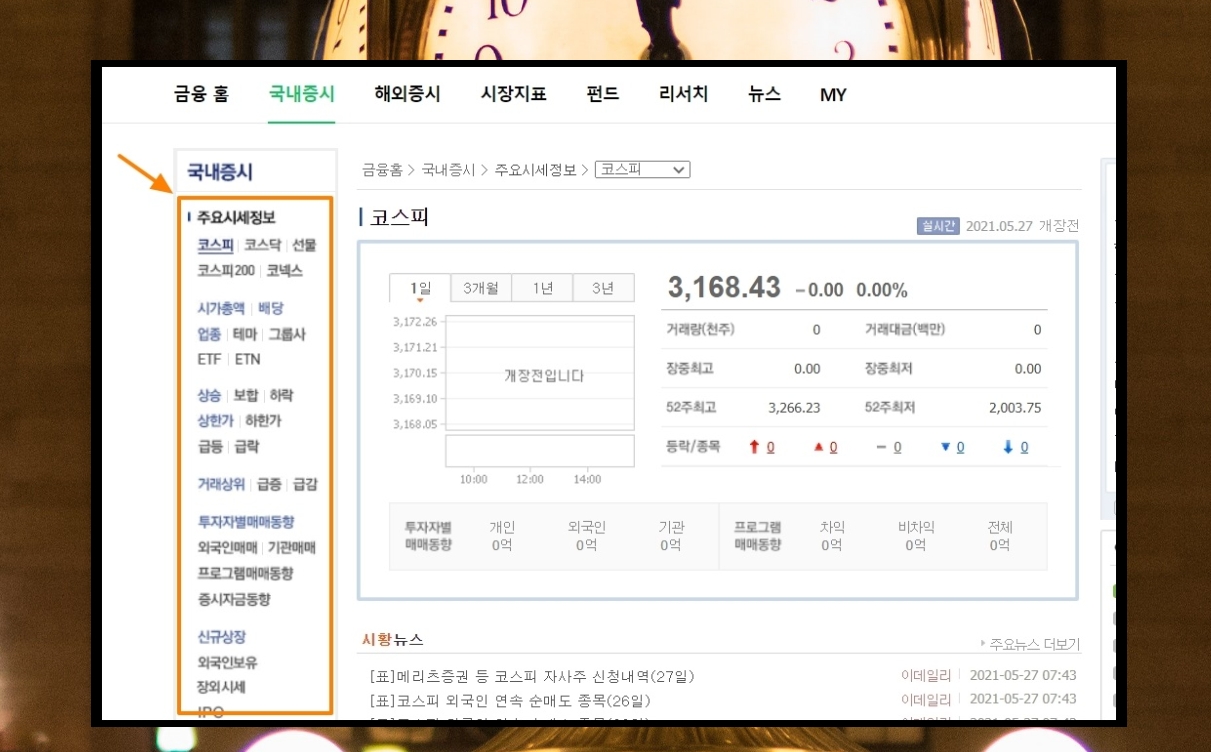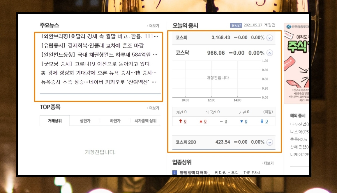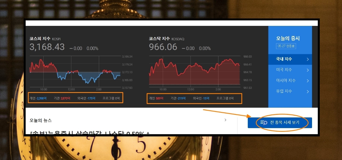 5. 사이트에 접속하면 오늘의 주요뉴스와 증시에 대한 것을 조회해 주세요. 코스피와 코스닥 지수를 통해 금일 분위기가 어떠한지 알 수 있어요. 물론 지수가 내려간다고 해서 개별 주식가격이 하락하는 것은 아닌데요. 대체적으로는 하락하는 경향이 있습니다. 특히 요즘에는 좀 더 그런 것 같아요.