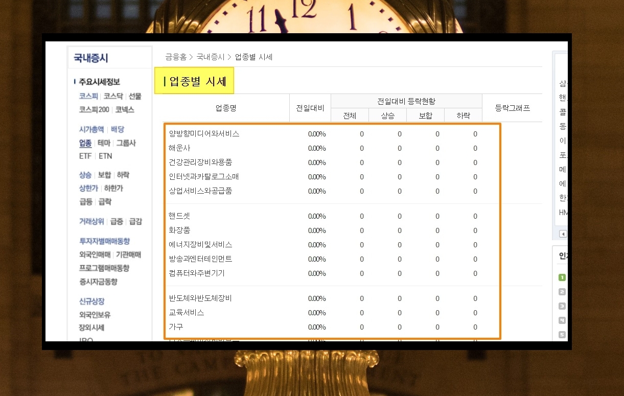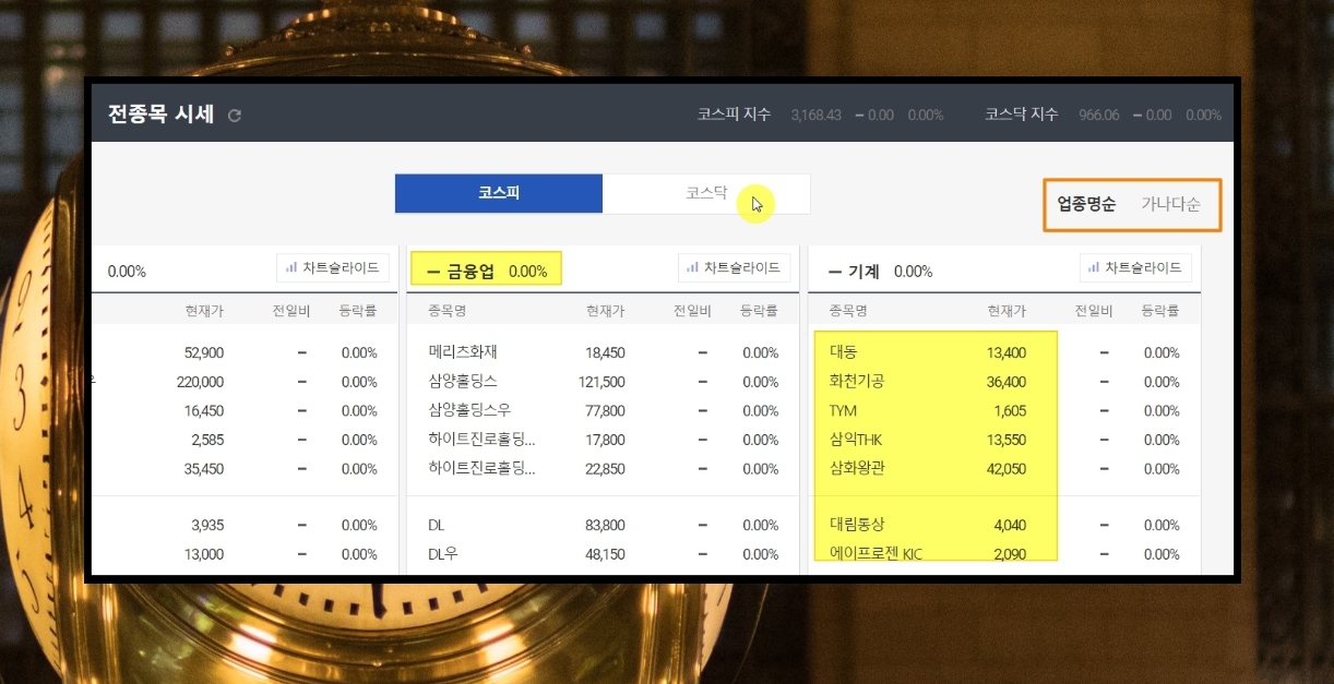 3. 한 눈에 전체적으로 금일 주식시세 조회를 할 수 있는 페이지가 열렸습니다. 코스피와 코스닥에 포함이 된 모든 종목에 대한 주가 조회가 가능한데요. 업종별로 묶여져 있기 때문에 오늘 어떤 업종이 잘 나가는지 쉽게 알 수 있습니다. 개별 종목에 대한 현재가, 전일비, 등락률도 표시가 되어 있기 때문에 함께 보기 좋고요.