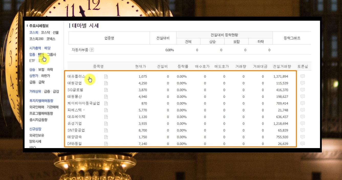 9. 테마 이름을 클릭하면 해당 테마에 속한 것이 나타나는데요. 여기에서 해당 종목에 대한 현재가, 전일비, 등락률, 매수호가, 매도호가, 거래량, 거래대금 확인이 가능합니다. 이름을 클릭하면 좀 더 상세한 내용을 확인할 수 있어요.