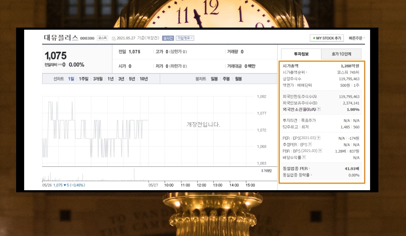 10. 저는 "대유플러스" 종목을 선택했는데요. 새롭게 열린 페이지를 통해 오늘의 주식시세 정보를 만나볼 수 있습니다. 실시간으로 움직이는 차트도 여기서 확인할 수 있습니다. 투자정보를 통해 해당 종목에 대해 알아볼 수도 있고요.