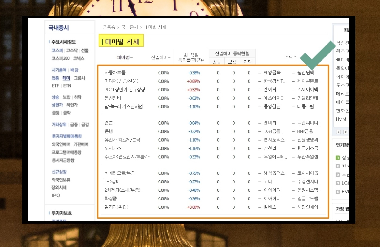 8. 이곳에서는 여러 테마에 묶인 주식에 대한 오늘의 시세 확인이 가능한데요. 주도주가 무엇인지도 이를 통해 알 수 있습니다.