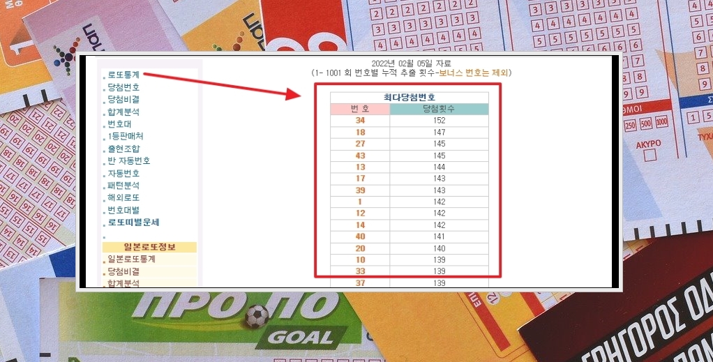4. 첫 번째는 로또 통계 서비스입니다. 1회부터 지금까지 최다 당첨번호를 확인할 수 있습니다. 34번이 152회로 가장 많이 당첨이 되었다는 것을 알 수 있습니다.