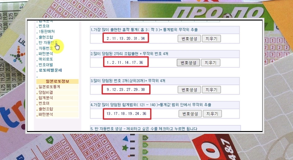 7. 이 외에도 다양한 로또 번호 분석 자료를 살펴볼 수 있는데요. 단순히 자료를 살펴보는 것보다 활용하면 더욱 좋습니다. 메뉴에서 [반 자동번호]를 클릭해 봅니다. 그럼 번호 생성 서비스를 이용할 수 있습니다. 가장 많이 출현한 홀짝 통계, 많이 당첨된 2자리 조합출현, 만힝 당첨된 번호 등 여러 가지 분석 결과를 쉽게 활용할 수 있도록 되어 있습니다.