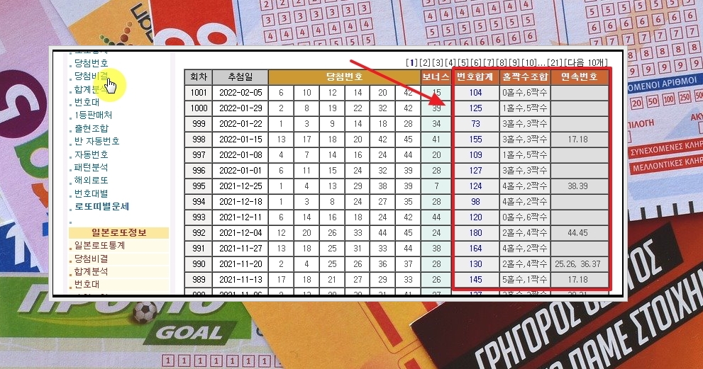 5. 두번째 당첨비결을 클릭해 보겠습니다. 회차에 따라 번호합계, 홀짝수조합, 연속번호 확인이 가능합니다.